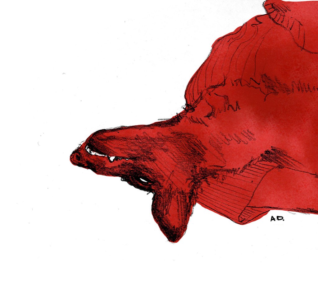 Carne. Amo il disegno con la linea pulita e il bianco e nero ma qualche volta ha un effetto troppo piatto, così ho seguito il consiglio del mio professore di Illustrazione, Stefano Ricci, che mi ha detto di colorare una superficie, di scannerizzarla e di usarla come base.