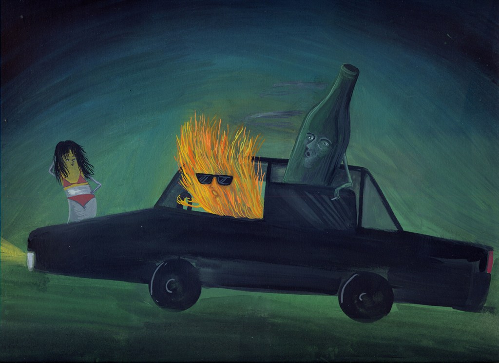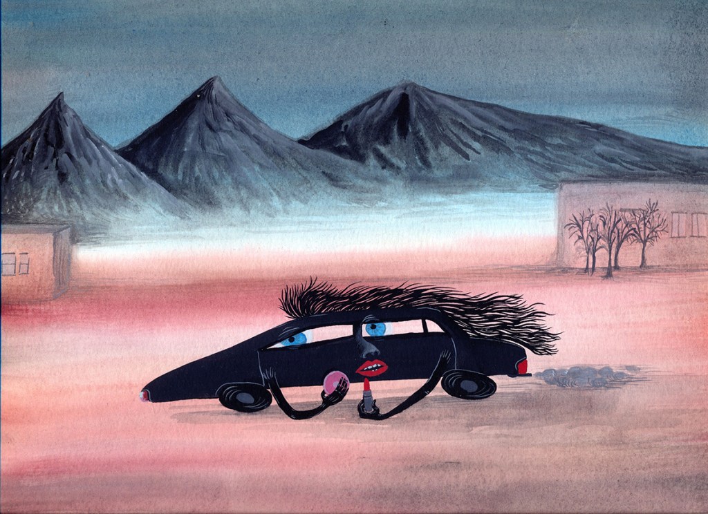 Ci sono elementi ricorrenti nelle mio immaginario, come i grattacieli o palazzi delle città, fabbriche fumanti, strade, sigarette e oggetti vari, gli esseri umani sono pochi e a volte assenti, rappresentati più in base a ciò che rappresentano che in base a ciò che sono.
