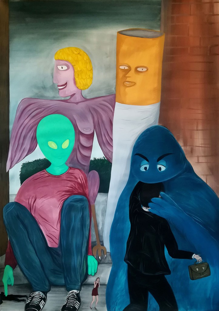 There are recurring elements in my imagination, such as skyscrapers or city buildings, smoking factories, streets, cigarettes and various objects, human beings are few and sometimes absent, represented more according to what they represent than according to what they are.