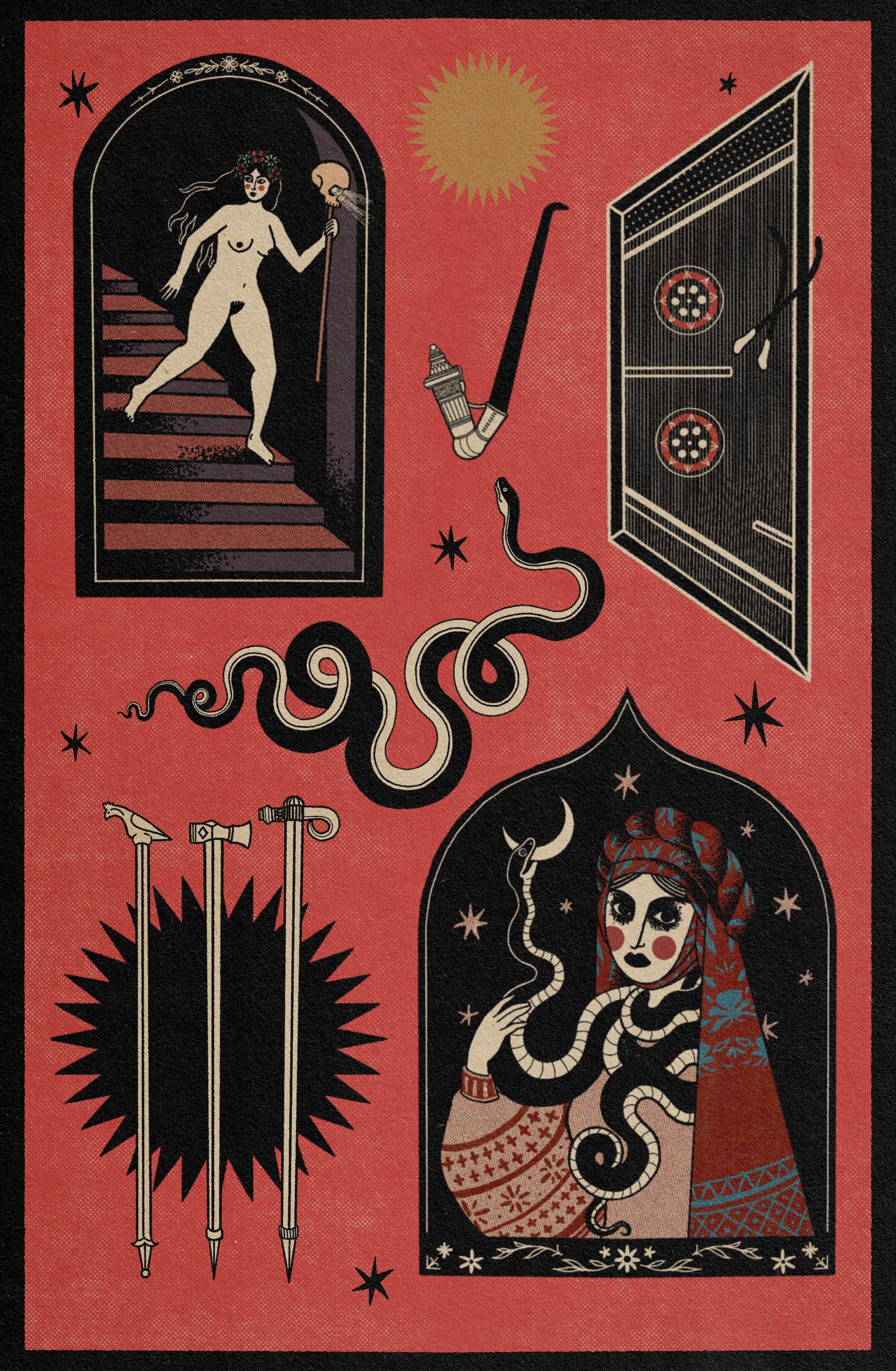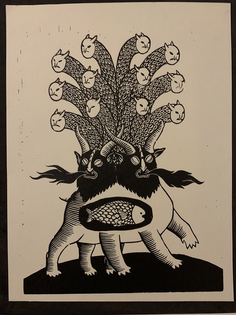 Maria Khymynets is a Ukrainian artist born on the Western side of the Carpathian Mountains in the town of Užhorod. She works with graphic art, painting, woodcarving and printmaking as well as digital art. The main topic in her art is Ukrainian and Carpathian-Ukrainian mysticism and magic, reflection on the Old Ways and Old Religion that are going through their rebirth.